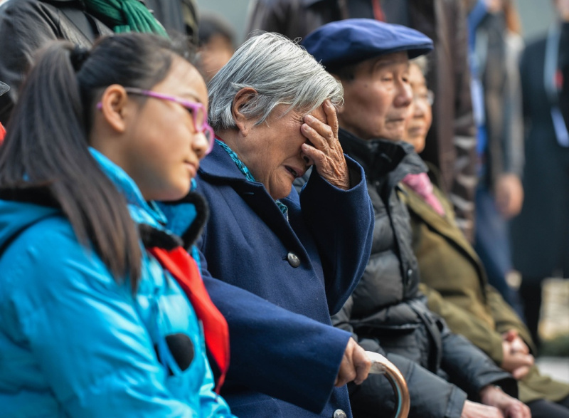 12月4日,南京大屠杀幸存者仇秀英(前左二)在活动上掩面而泣。当日,第二场南京大屠杀死难者遗属家庭祭告活动在侵华日军南京大屠杀遇难同胞纪念馆举行。人们在纪念馆遇难者名单墙前悼念逝去的亲人。新华社记者 季春鹏 摄