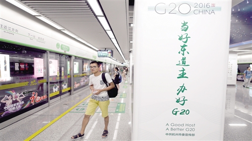 G20领导人峰会于9月4日至5日在杭州举行,中国作为本届峰会东道主,推动各方把创新和结构性改革作为开创世界发展新局的主线,引领了世界经济和全球治理的前进方向。图为在杭州地铁市民中心站,乘客从G20宣传语旁走过。(新华社发)