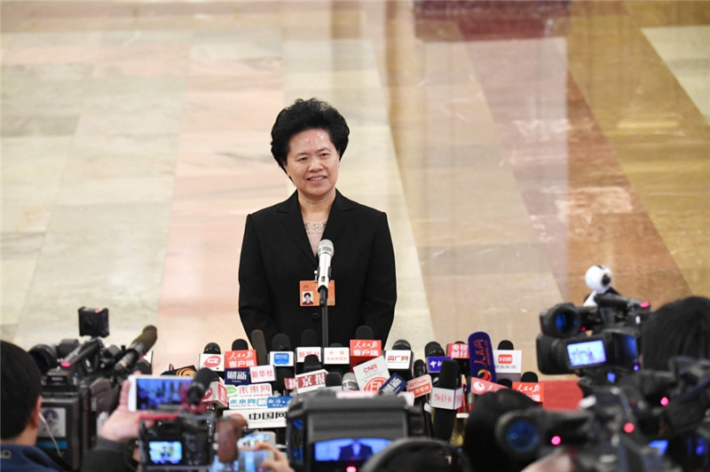 3月5日,第十二届全国人民代表大会第五次会议在北京人民大会堂开幕。这是国家信访局局长舒晓琴接受采访。新华社记者 赵颖全 摄