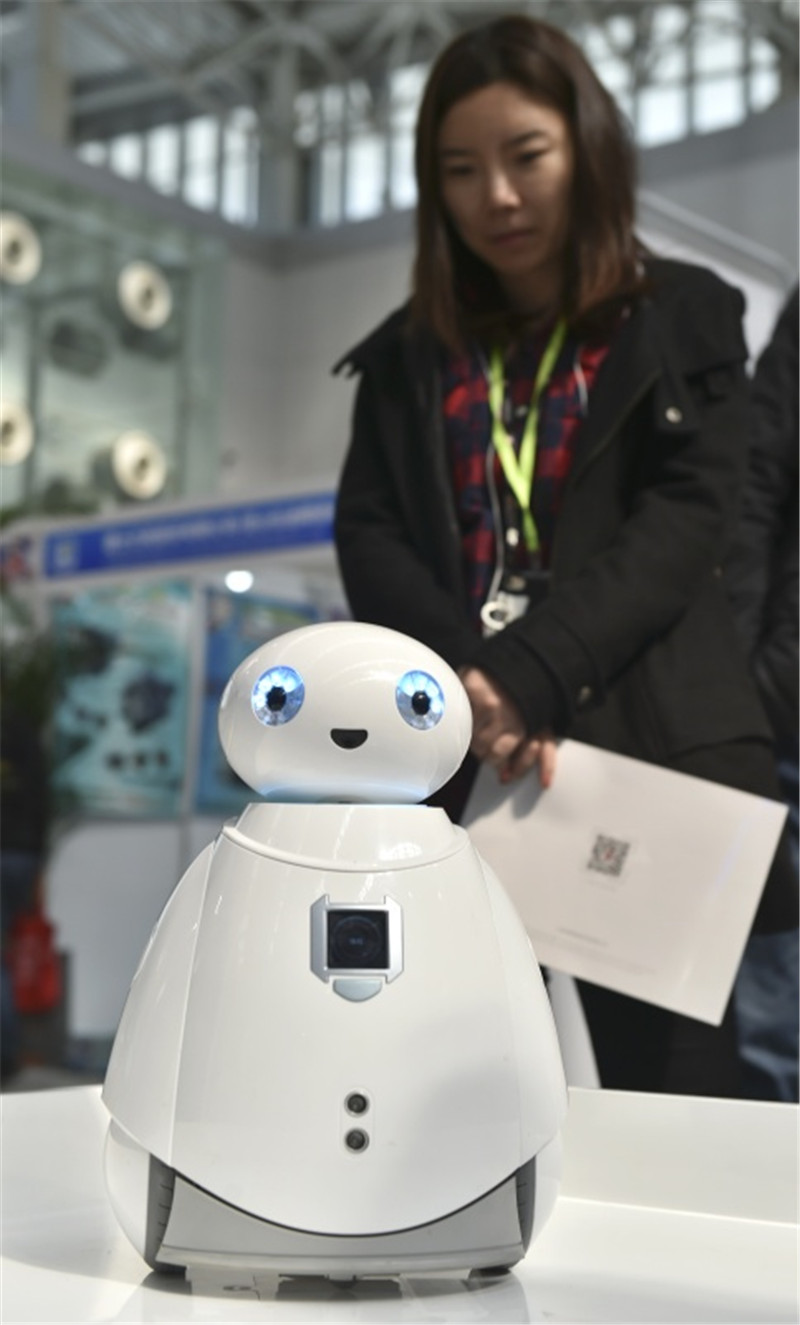 3月9日,观众在天津梅江会展中心参观教育机器人。