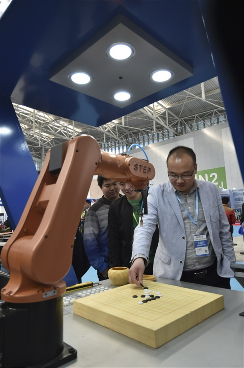 3月9日,在天津梅江会展中心,观众在与机器人下棋。