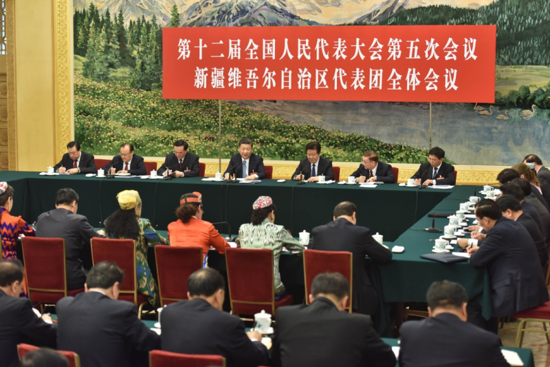 3月10日,中共中央总书记、国家主席、中央军委主席习近平参加十二届全国人大五次会议新疆代表团的审议。