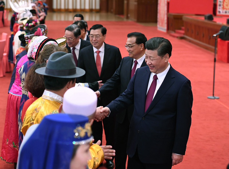 人民大会堂宴会厅灯火辉煌,欢声笑语,洋溢着喜庆热烈的气氛。19时45分,在欢快的乐曲声中,习近平等党和国家领导人走进会场,全场响起热烈掌声。习近平等微笑着同身着民族服装的少数民族代表委员亲切握手、互致问候。