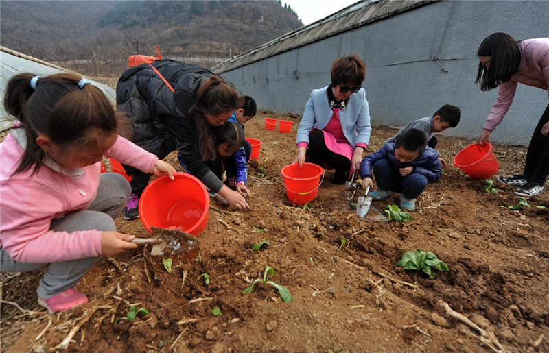3月19日,家长带着孩子品尝北京农村的春宴。