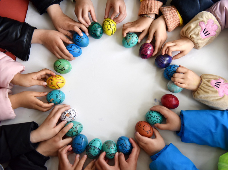 3月20日,江苏省东海县幼儿园教育集团的老师和小朋友玩“立蛋”游戏。