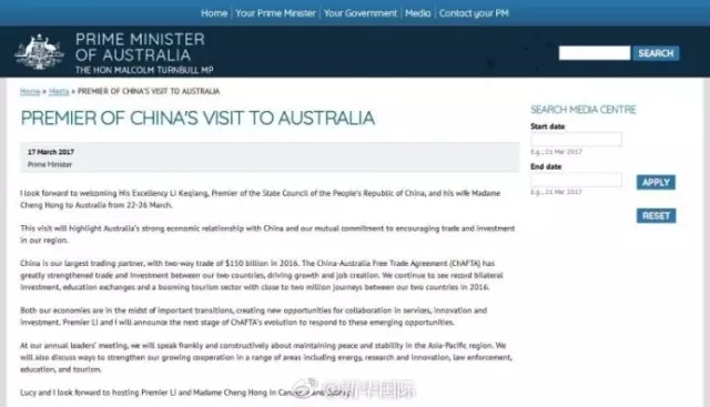 澳大利亚总理特恩布尔在“总理官网”上发文欢迎李克强总理夫妇,并表示此访将凸显澳中两国强有力的经济关系,以及两国鼓励本地区贸易投资的共同承诺。