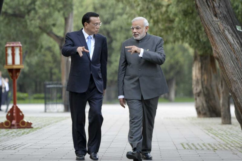 △2015年5月,李克强总理在北京天坛公园与印度总理莫迪共同出席中印文化交流活动。活动后,两国总理在林间小路散步交谈。
