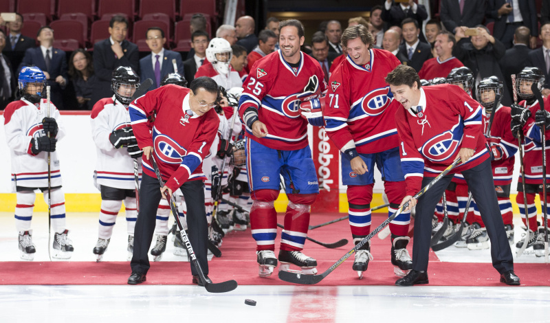 △2016年9月,李克强总理在加拿大总理特鲁多陪同下,参观蒙特利尔“加拿大人”冰球队。李克强总理穿上球衣,与特鲁多一起为参加训练的小球员开球。