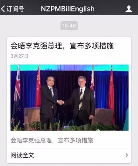 就在李克强总理抵达新西兰前,新西兰总理英格利希在中国的微信上开了一个公众号“NZPMBillEnglish”,并发出了自己的第一篇文章:《欢迎李克强总理》。