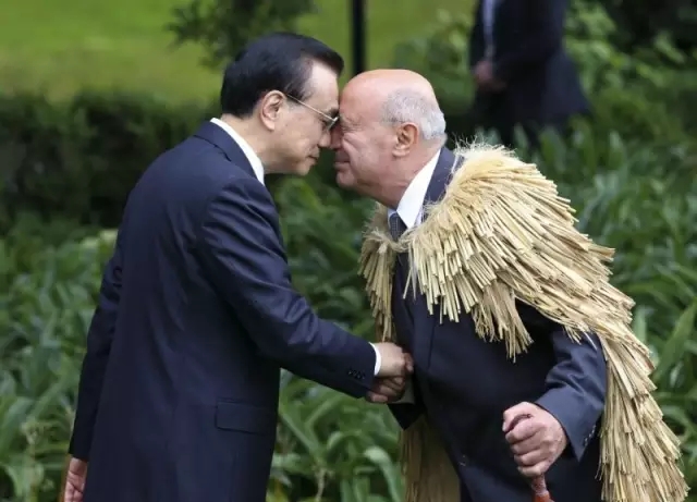 当地时间27日上午,新西兰总理英格利希在惠灵顿的总督府大草坪举行仪式欢迎李克强总理。李克强夫妇与两名毛利文化顾问行“碰鼻礼”,并观看具有毛利文化特色的挑战、欢呼仪式和欢迎舞。随后,李克强检阅了新三军仪仗队。仪式完毕后,两国总理夫妇进入总督府合影留念。新华社发