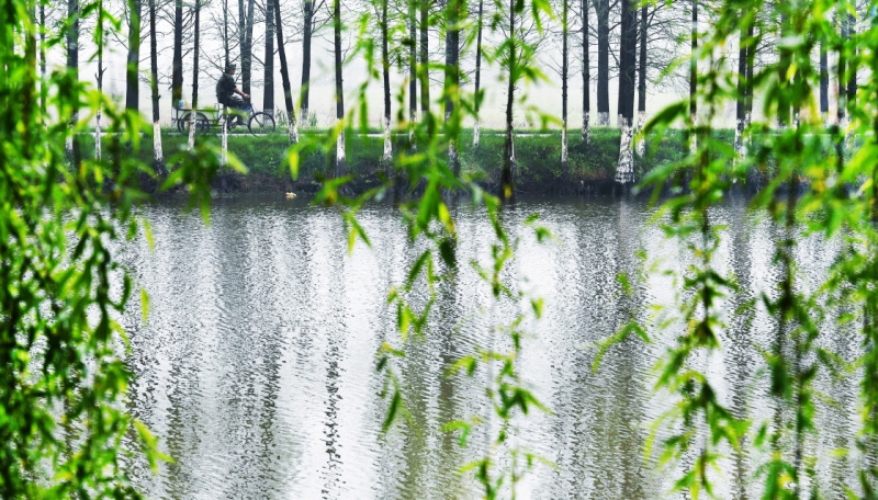 4月7日,一位备耕的农民骑行在杨柳吐绿的柿树岗乡周桥新村水塘埂上。