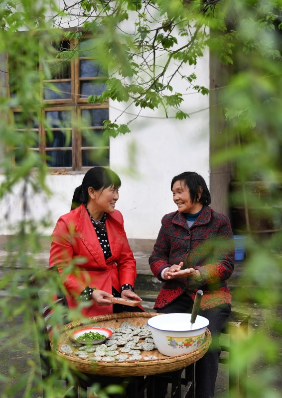 4月7日,柿树岗乡新街社区的丁立凤(右)在庭院里制作蒿子粑粑。