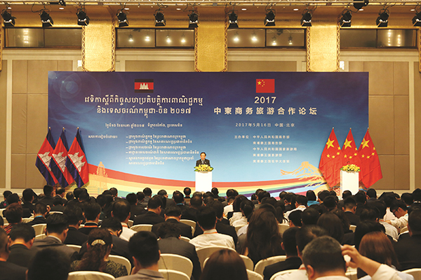 5月16日下午,由中国国家旅游局、中国商务部、柬埔寨王国旅游部、柬埔寨王国商业部共同主办的2017中柬商务旅游合作论坛在京举行。柬埔寨王国首相洪森、中国全国政协副主席王家瑞,中国国家旅游局局长李金早、中国商务部副部长房爱卿,柬埔寨王国旅游部大臣唐坤、柬埔寨王国商业部大臣潘索萨出席论坛开幕式并发表致辞。