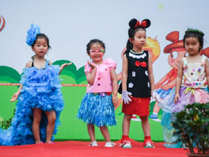 6月1日,孩子们身着用废纸、废塑料袋、废纸杯等废旧生活用品制作的环保服装参加“六一”环保时装秀。