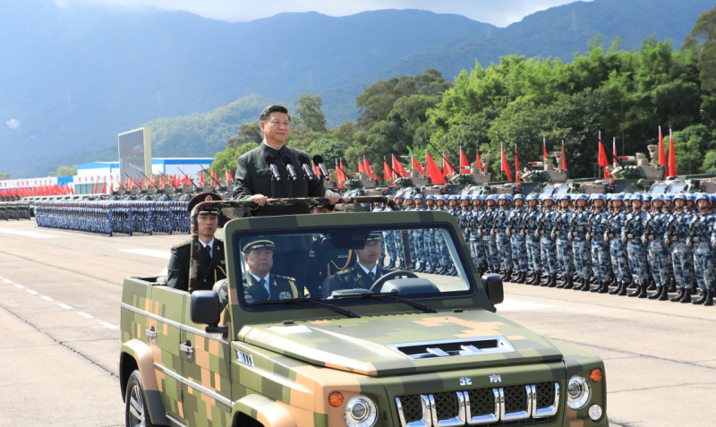 军乐队奏响雄壮的阅兵曲。习近平乘车依次检阅驻香港部队20个方队。3100余名受阅官兵军容严整、意气风发,防空导弹、轮式装甲车、武装直升机等武器装备整齐列阵、威风凛凛。“同志们好!”“主席好!”“同志们辛苦了!”“为人民服务!”习近平的亲切问候鼓舞士气,官兵们响亮的回答声震长空。观礼台上不时响起热烈掌声。