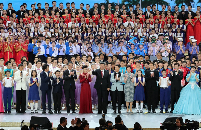 晚会最后,习近平在梁振英和香港特别行政区候任行政长官林郑月娥陪同下走上舞台,同主要演职人员一一握手,并同全场一起高唱《歌唱祖国》,祝愿伟大祖国繁荣昌盛,祝福香港明天更加美好。晚会达到高潮,全场响起经久不息的热烈掌声。