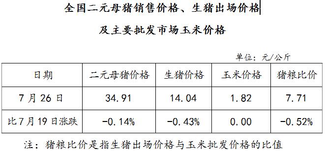 全国二元母猪销售价格、生猪出场价格及主要批发市场玉米价格(7月26日)