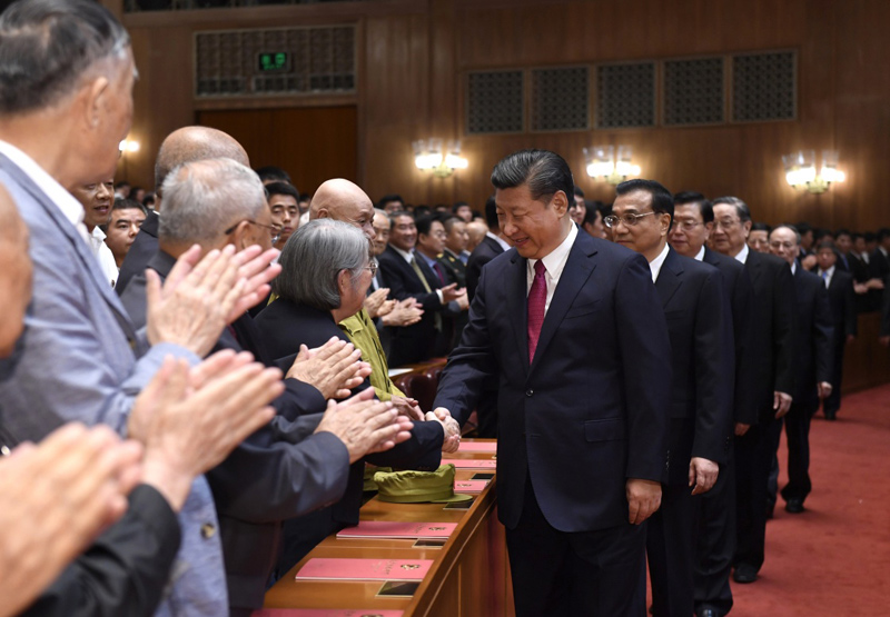 7月28日,庆祝中国人民解放军建军90周年文艺晚会《在党的旗帜下》在北京人民大会堂举行。中共中央总书记、国家主席、中央军委主席习近平和李克强、张德江、俞正声、刘云山、王岐山、张高丽等党和国家领导人,与首都3000多名各界群众一起观看演出。演出开始前,习近平等与老战士、老同志代表和“八一勋章”获得者亲切握手。新华社记者 李学仁 摄