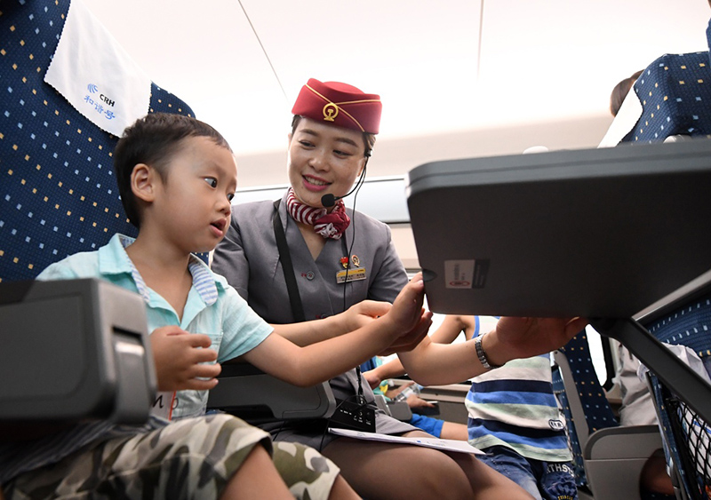 8月5日,在南宁东站一列动车上,工作人员指导小朋友使用车上设施。
