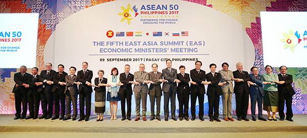 9月9日,在菲律宾马尼拉率团参加东亚合作经贸部长系列会议期间,中国商务部部长钟山出席了第5次东亚峰会国家(EAS)经贸部长会议。