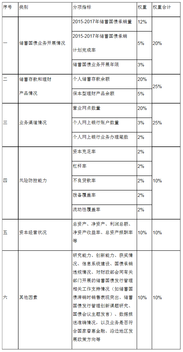 评审指标包括6个方面:储蓄国债业务开展情况、储蓄存款和理财产品情况、业务渠道情况、风险防控能力、资本经营状况、其他因素,权重分别为20%、25%、25%、10%、10%、10%(详见表1)。