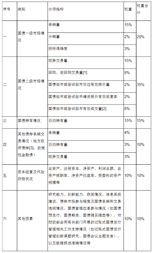 评审指标包括6个方面:国债一级市场情况、国债二级市场情况、国债持有情况、其他债券承销交易情况、资本经营及风险防控状况、其他因素,权重分别为20%、35%、15%、10%、10%、10%(详见表2)。