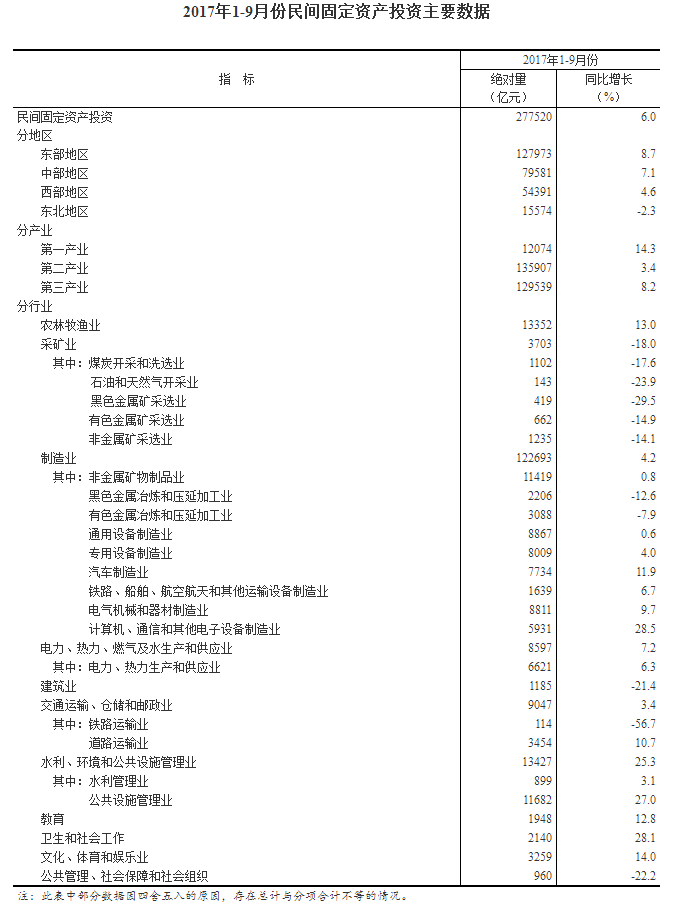 2017年1-9月份民间固定资产投资增长6%
