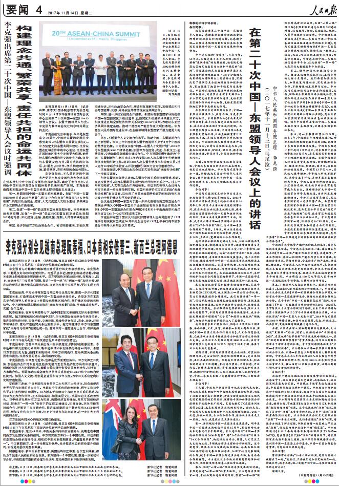 李克强指出,不久前召开的中国共产党第十九次全国代表大会对从现在到本世纪中叶中国的发展作出战略部署,确定了宏伟目标,这将给中国和世界各国合作提供更多机遇和更广空间。李克强就面向未来推动中国-东盟关系更上层楼提出五点建议: