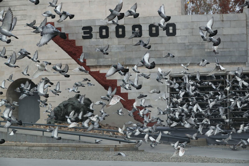 12月13日,和平鸽从南京大屠杀死难者国家公祭仪式现场上空飞过。