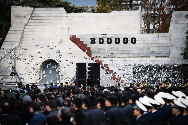 12月13日,南京大屠杀死难者国家公祭仪式现场放飞和平鸽。