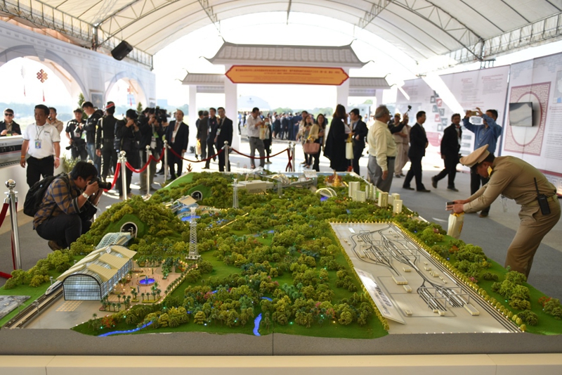 12月21日,在泰国东北部呵叻府巴冲县,人们在中泰铁路合作项目一期工程开工仪式上参观项目沙盘模型。