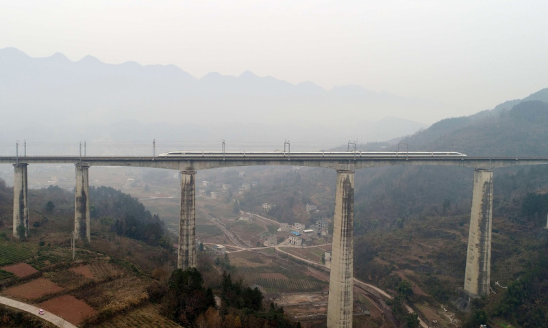 12月23日,一列动车经过宜万铁路湖北省恩施市境内。