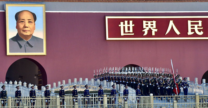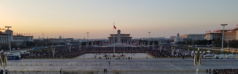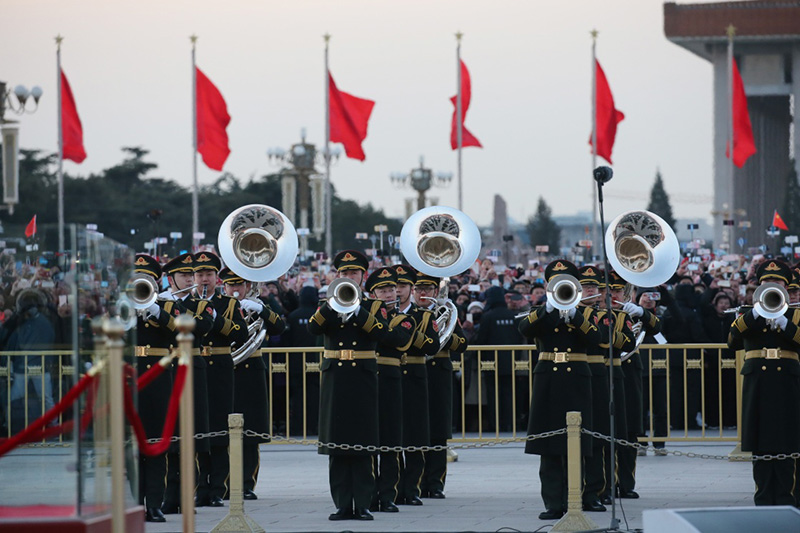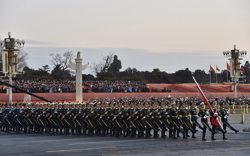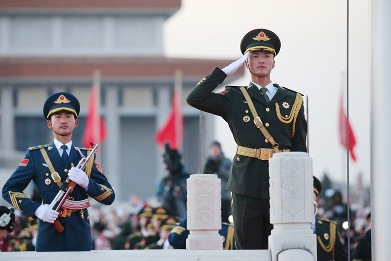 1月1日晨,北京天安门广场举行隆重的升国旗仪式,这是由人民解放军担负国旗护卫任务后,首次举行的升旗仪式。来自全国各地的数万名群众观看新年第一次升国旗仪式。