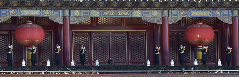 1月1日晨,北京天安门广场举行隆重的升国旗仪式,这是由人民解放军担负国旗护卫任务后,首次举行的升旗仪式。图为礼号手在天安门城楼吹响升旗号角。