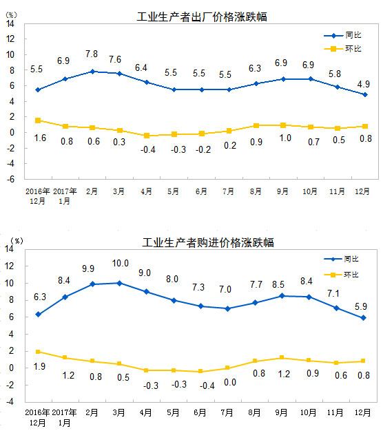 2017年12月份,全国工业生产者出厂价格同比上涨4.9%,环比上涨0.8%。工业生产者购进价格同比上涨5.9%,环比上涨0.8%。2017年全年,工业生产者出厂价格同比上涨6.3%,工业生产者购进价格同比上涨8.1%。