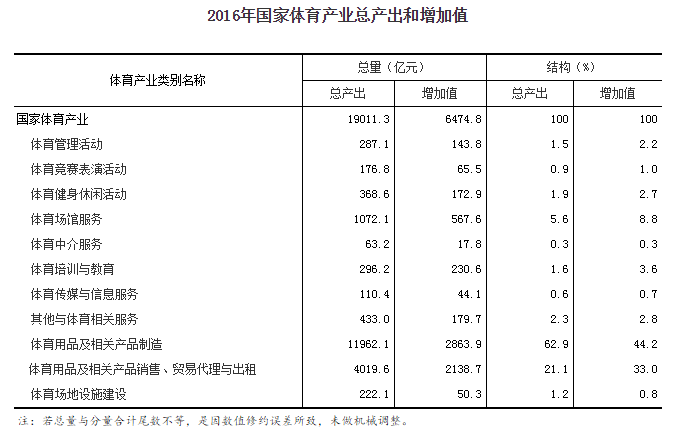 经核算,2016年,国家体育产业总规模(总产出)为1.9万亿元,增加值为6475亿元,占同期国内生产总值的比重为0.9%。从名义增长看,总产出比2015年增长了11.1%,增加值增长了17.8%。