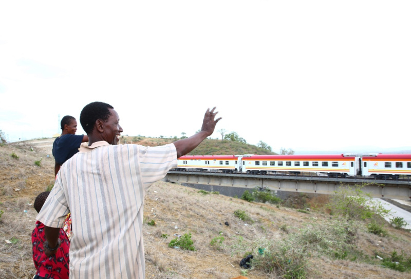 一年前,国家主席习近平在世界经济论坛年会和联合国日内瓦总部发表两场历史性演讲,向世界描绘一幅构建人类命运共同体的壮美蓝图,产生了强烈反响。2017年4月29日,在肯尼亚蒙巴萨,穆甘达村的村民观看列车从蒙内铁路马泽拉斯大桥上驶过。蒙内铁路是肯尼亚独立以来的首条新铁路,由中国路桥承建,全线采用中国标准。新华社记者 潘思危 摄