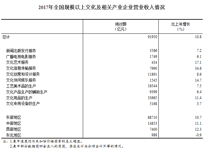 据对全国规模以上文化及相关产业5.5万家企业调查,2017年,上述企业实现营业收入91950亿元,比上年增长10.8%(名义增长,未扣除价格因素),增速提高3.3个百分点,继续保持较快增长。