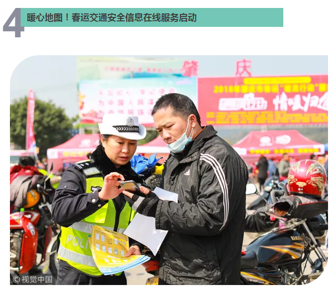 日前,公安部交管局推出“温暖回家路”春运交通安全信息在线服务,依托电子地图,为自驾出行、摩托返乡人群提供行经路线沿途交通安全提示信息。同时,利用移动互联网新技术新平台和互联网大数据,综合研判推荐最佳返乡路线、提供个性化路况事件提示。