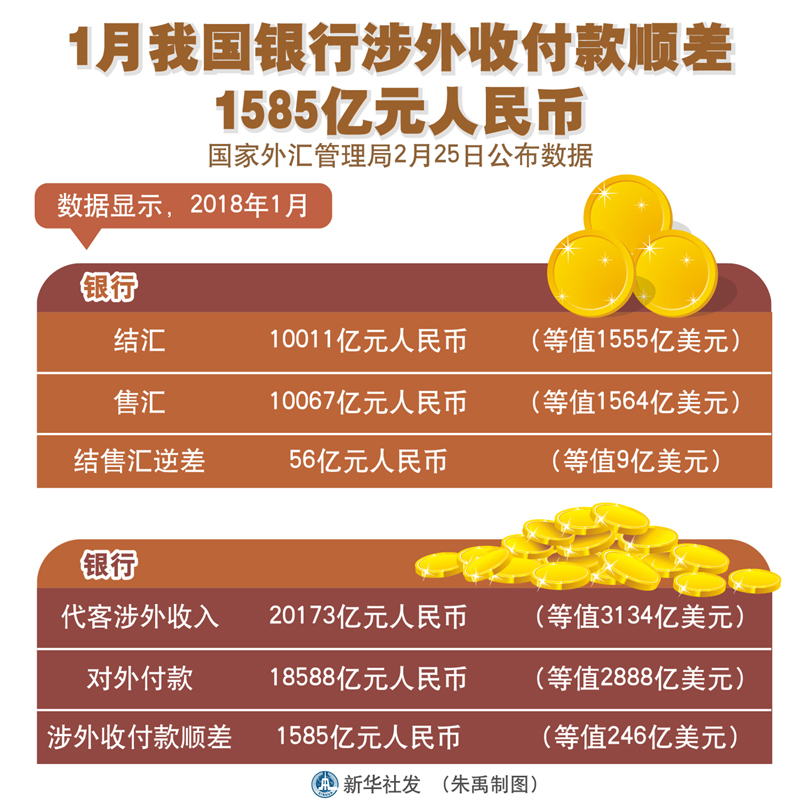 图表:1月我国银行涉外收付款顺差1585亿元人民币