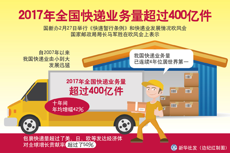 图表:2017年全国快递业务量超过400亿件