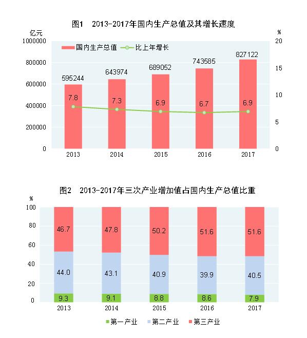 初步核算,全年国内生产总值[2]827122亿元,比上年增长6.9%。其中,第一产业增加值65468亿元,增长3.9%;第二产业增加值334623亿元,增长6.1%;第三产业增加值427032亿元,增长8.0%。第一产业增加值占国内生产总值的比重为7.9%,第二产业增加值比重为40.5%,第三产业增加值比重为51.6%。全年最终消费支出对国内生产总值增长的贡献率为58.8%,资本形成总额贡献率为32.1%,货物和服务净出口贡献率为9.1%。全年人均国内生产总值59660元,比上年增长6.3%。全年国民总收入[3]825016亿元,比上年增长7.0%。