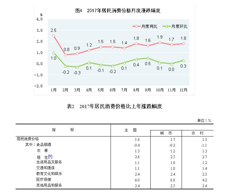 全年居民消费价格比上年上涨1.6%。工业生产者出厂价格上涨6.3%。工业生产者购进价格上涨8.1%。固定资产投资价格上涨5.8%。农产品生产者价格[8]下降3.5%。