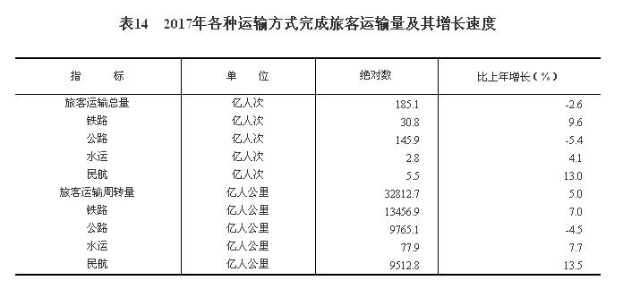全年旅客运输总量185亿人次,比上年下降2.6%。旅客运输周转量32813亿人公里,增长5.0%。