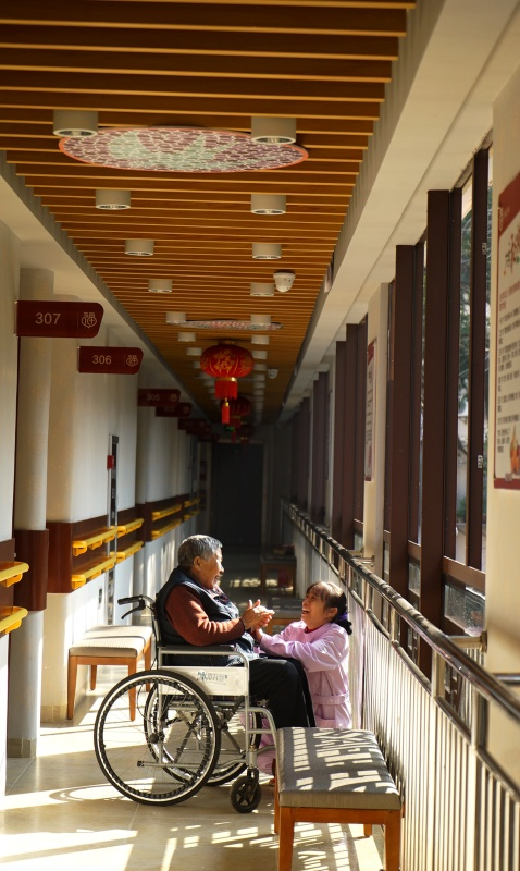 江西赣州市章贡区三康庙社区的护工肖政桃(右)陪着88岁的老人赵变灯聊天(2017年11月1日摄)。自2015年以来,江西赣州市章贡区将居家养老列为民生改革重点,通过提供日间照料、全科医生签约、绿色送餐等10余种养老服务,基本满足了当地老年人医疗和养老相结合的服务需求。