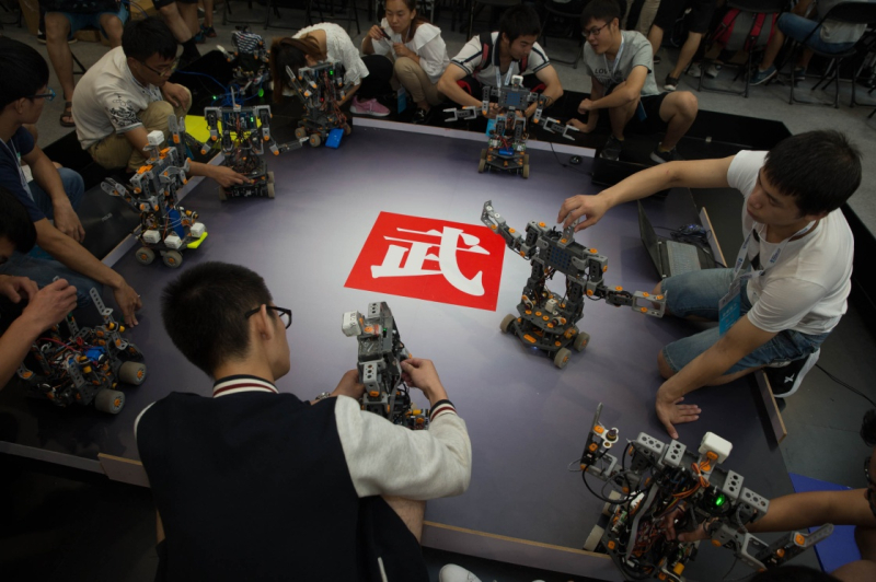 在北京亦创国际会展中心,参赛队员在调试格斗机器人(2017年8月23日摄)。