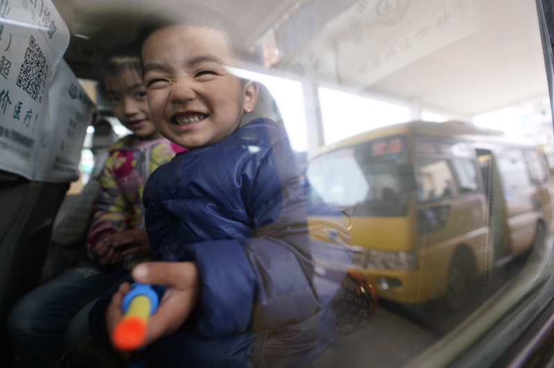 小朋友在福建省永安市小陶镇乘坐村镇公交(1月26日摄)。截至2017年底,永安市基本形成了以县道为骨架,乡道为支线,村道为脉络的农村公路网络体系,为农业农村发展提供交通运输保障。