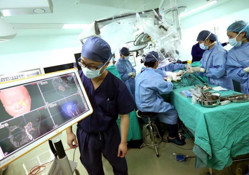 上海市浦南医院主刀医生在3D导航仪的帮助下实施颅内手术。3D导航仪可提高手术精准性,减少并发症,提升患者生存率(2017年4月8日摄)。