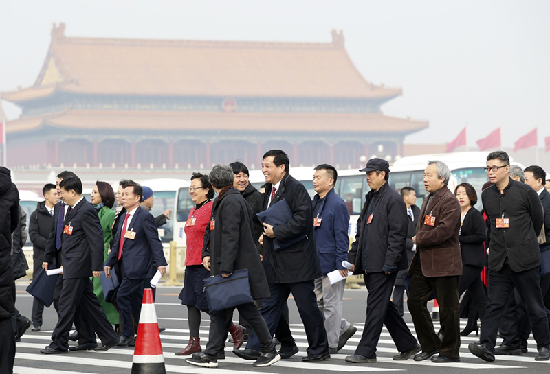 3月3日,中国人民政治协商会议第十三届全国委员会第一次会议在北京人民大会堂开幕。这是全国政协委员抵达天安门广场。