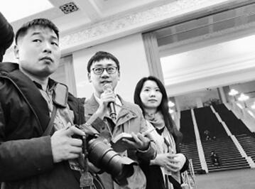 光明日报记者彭景晖(右二)在“部长通道”上向刘玉珠提问。光明网记者 王恩慧摄/光明图片